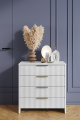 Комод «Хидд» имеет четыре ящика, которые обеспечивают достаточно места для хранения одежды, белья, игрушек или других вещей. Благодаря своим компактным размерам, комод может быть легко размещен в любой части комнаты, не занимая много места. Это делает его идеальным решением для маленьких комнат или для тех, кто хочет максимально использовать пространство. Фрезеровка «волна» на фасаде комода придает ему особый шарм и элегантность. Данная модель станет отличным дополнением к любому интерьеру и добавит ему индивидуальности.