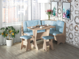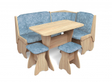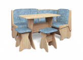 Набор мебели для кухни, включающий в себя угловую скамью, стол и два табурета. В угловой скамье под сиденьями расположены два ящика. Каркас ЛДСП. Покрытие верхней части столешницы стола - термостойкий пластик, кромка ПВХ - 1мм. Углы столешницы закруглены для избегания травмирования и придания лучшего эстетического вида.