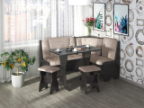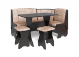 Набор мебели для кухни, включающий в себя угловую скамью, стол и два табурета. В угловой скамье под сиденьями расположены два ящика. Каркас ЛДСП. Покрытие верхней части столешницы стола - термостойкий пластик, кромка ПВХ - 1мм. Углы столешницы закруглены для избегания травмирования и придания лучшего эстетического вида.