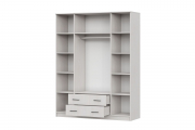 Шкаф комплектуется четырьмя распашными створками и разделен вертикальными перегородками на три отделения. По краям располагаются бельевые отделения шириной 384 мм. В каждой из них устанавливается по четыре полки. Посередине отделение шириной 768 мм. В нижней части отделения расположена секция с двумя выдвижными ящиками, в верхней - платяное отделение высотой 1512 мм с одной полкой сверху и металлической штангой.